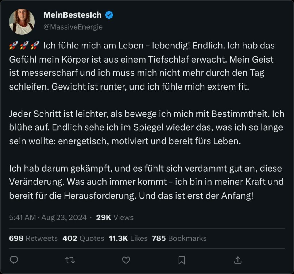 Oliver hat mir geholfen, wieder auf die richtige Bahn zu kommen. Ich hatte mit meinem Gewicht und meiner geringen Energie zu kämpfen, aber seine Anleitung hat wirklich geholfen. Ich habe abgenommen und meine Konzentration wiedererlangt. Jetzt kann ich wieder mit meinen Kindern spielen und meine Geschäftsziele verfolgen – ich bin aufgeblüht!